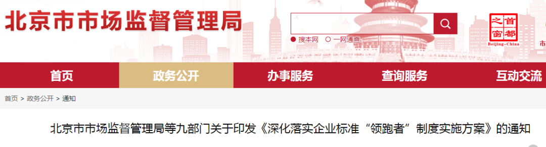 為落實(shí)《中共北京市委 北京市人民政府關(guān)于加快培育壯大新業(yè)態(tài)新模式促進(jìn)北京經(jīng)濟(jì)高質(zhì)量發(fā)展的若干意見(jiàn)》,按照《市場(chǎng)監(jiān)管總局等八部門關(guān)于實(shí)施企業(yè)標(biāo)準(zhǔn)“領(lǐng)跑者”制度的意見(jiàn)》要求,市市場(chǎng)監(jiān)管局等九部門制定了《深化落實(shí)企業(yè)標(biāo)準(zhǔn)“領(lǐng)跑者”制度實(shí)施方案》,經(jīng)市政府批準(zhǔn),現(xiàn)印發(fā)給你們。請(qǐng)認(rèn)真貫徹落實(shí),鼓勵(lì)企業(yè)創(chuàng)制先進(jìn)標(biāo)準(zhǔn),促進(jìn)新業(yè)態(tài)新模式發(fā)展壯大,以高標(biāo)準(zhǔn)推動(dòng)北京經(jīng)濟(jì)高質(zhì)量發(fā)展。