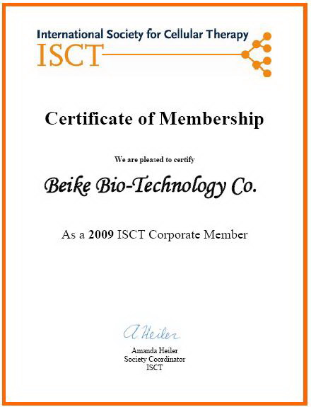2009年8月,北科生物獲得國際細(xì)胞治療協(xié)會(International Society for Cellular Therapy,ISCT)會員資格,并獲得了該協(xié)會頒發(fā)的會員證書,成為該機(jī)構(gòu)的正式會員。