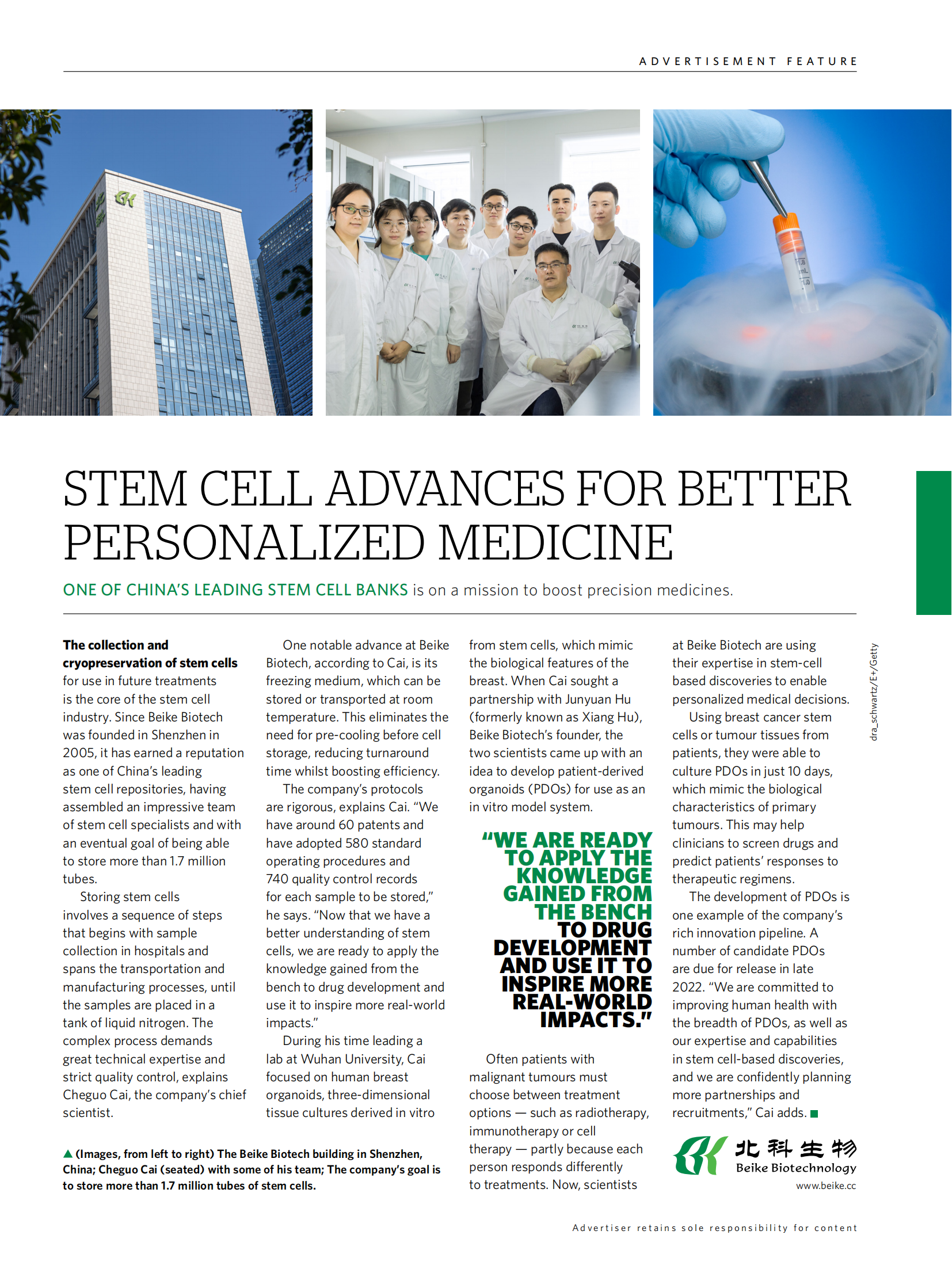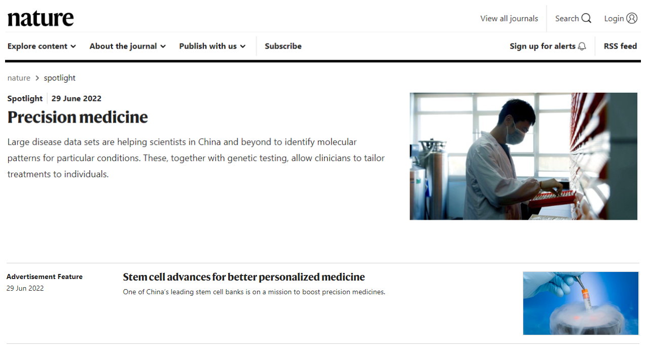 2022年6月29日,《Nature》官網(wǎng)nature spotlight增刊的“自然聚焦-中國(guó)精準(zhǔn)醫(yī)療”板塊在線發(fā)表了北科生物首席科學(xué)家蔡車(chē)國(guó)教授團(tuán)隊(duì)的主題文章:干細(xì)胞進(jìn)展推動(dòng)更好的個(gè)性化醫(yī)療。干細(xì)胞進(jìn)展推動(dòng)更好的個(gè)性化醫(yī)療